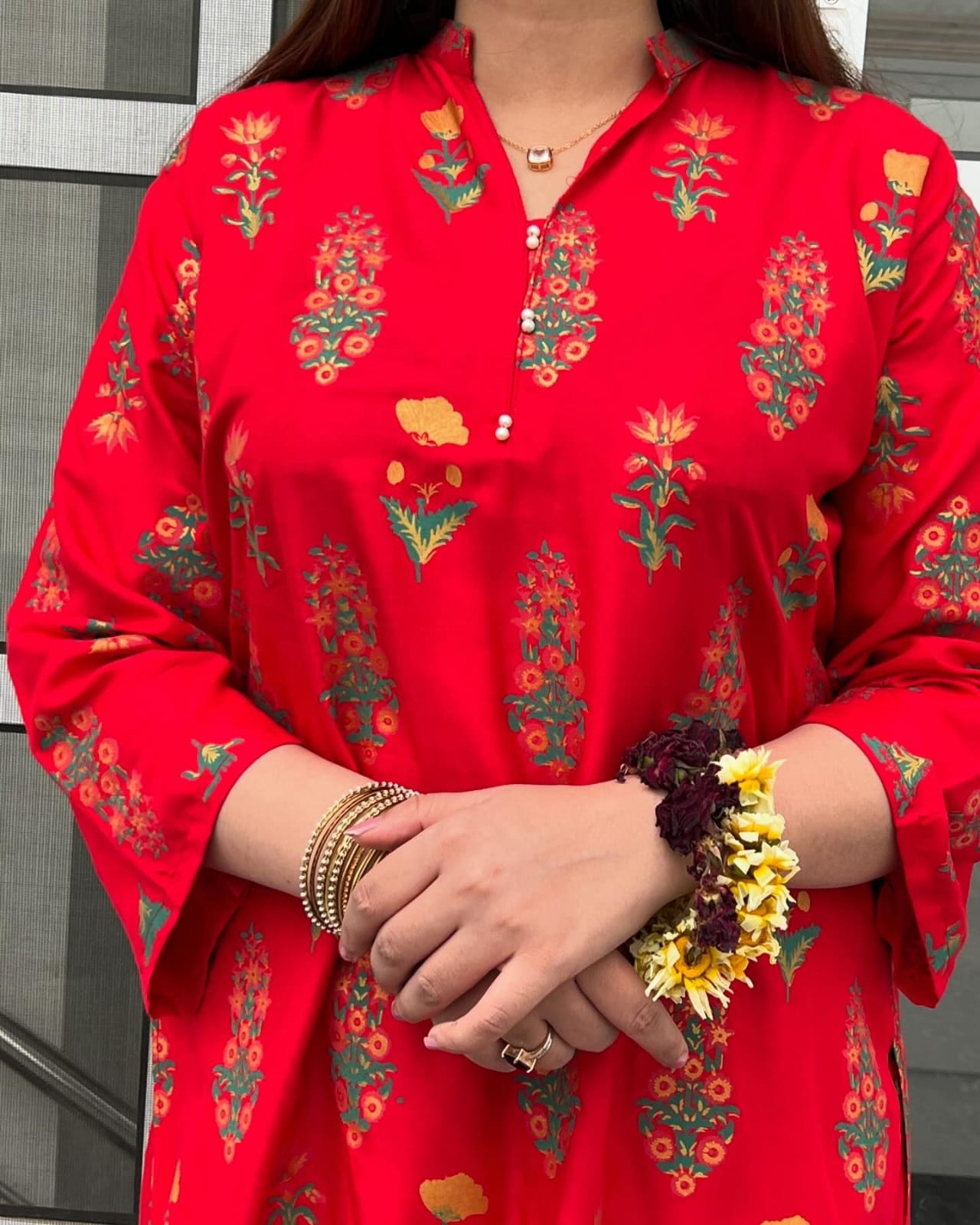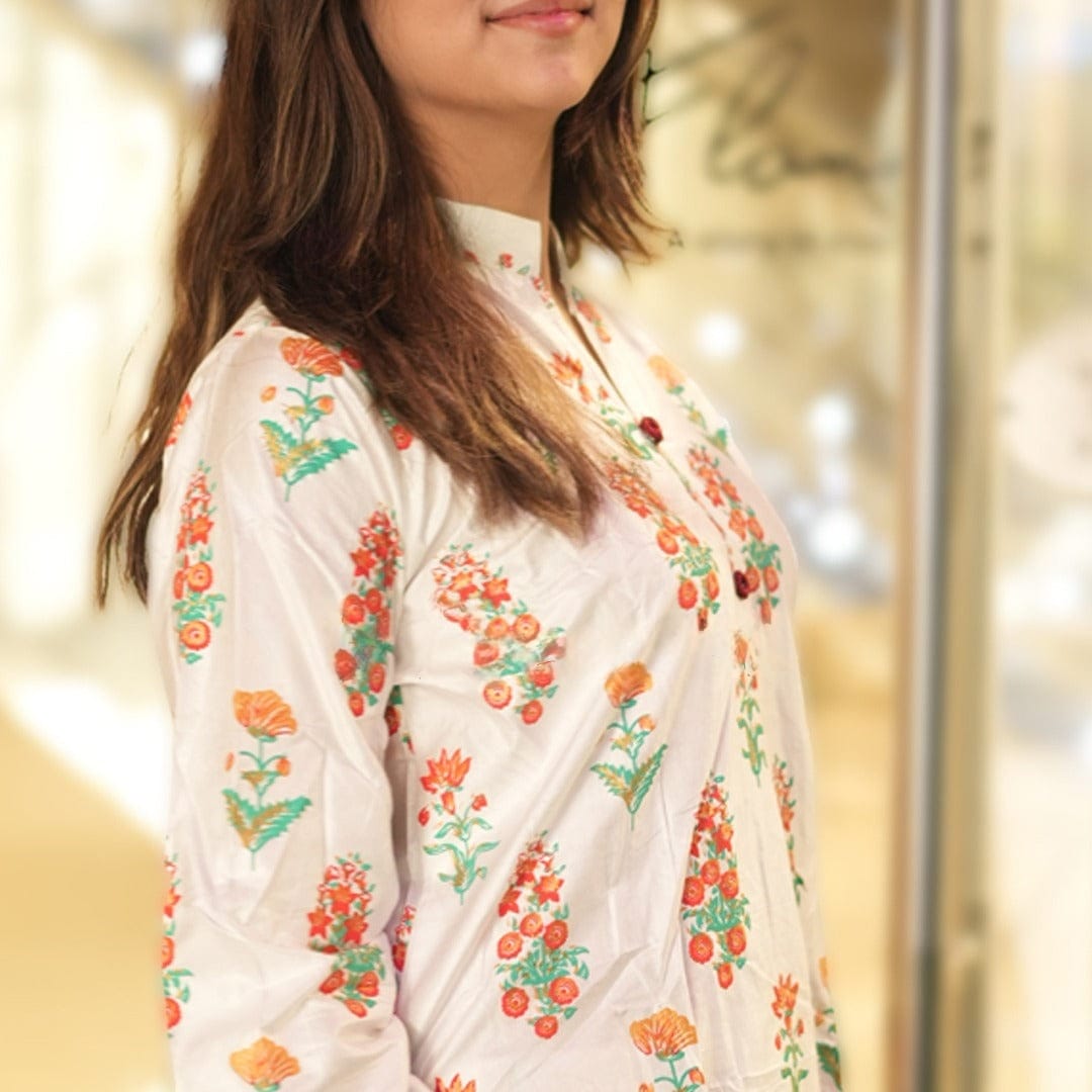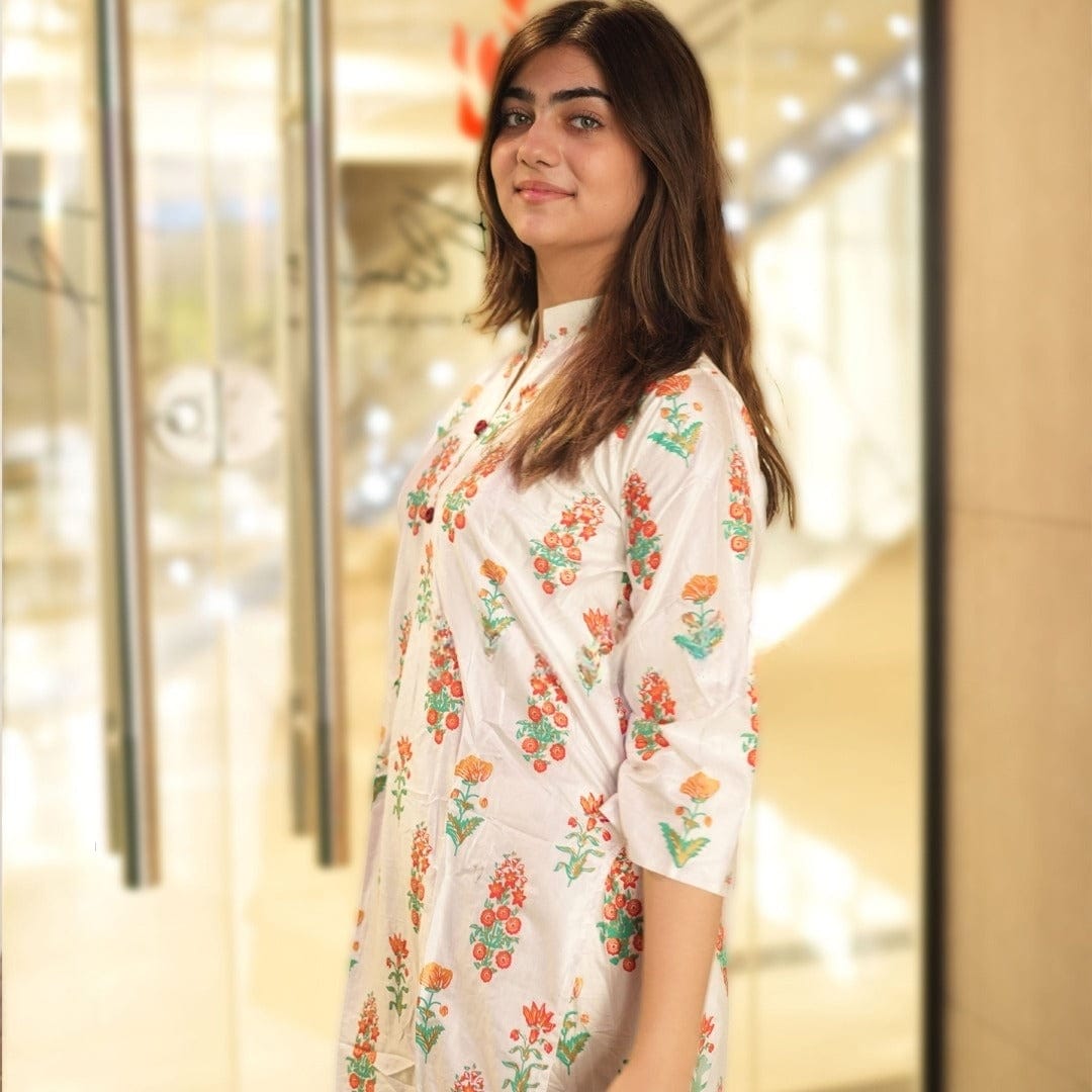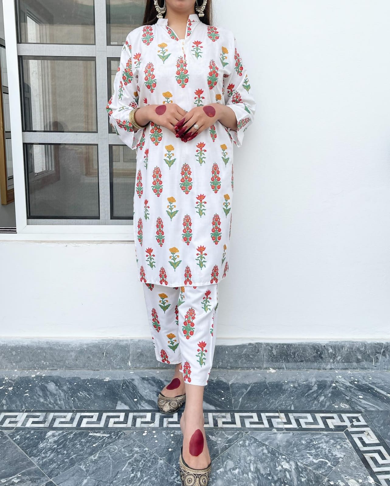 Flower Print 2pcs Sizes : Medium & Large ▶️Chest : 21 ( Large 22.5 )▶️Length : 38▶️Fabric : Arbaic lawn ▶️Print : Block print Trouser : ▶️Length : 38▶️Waist :...